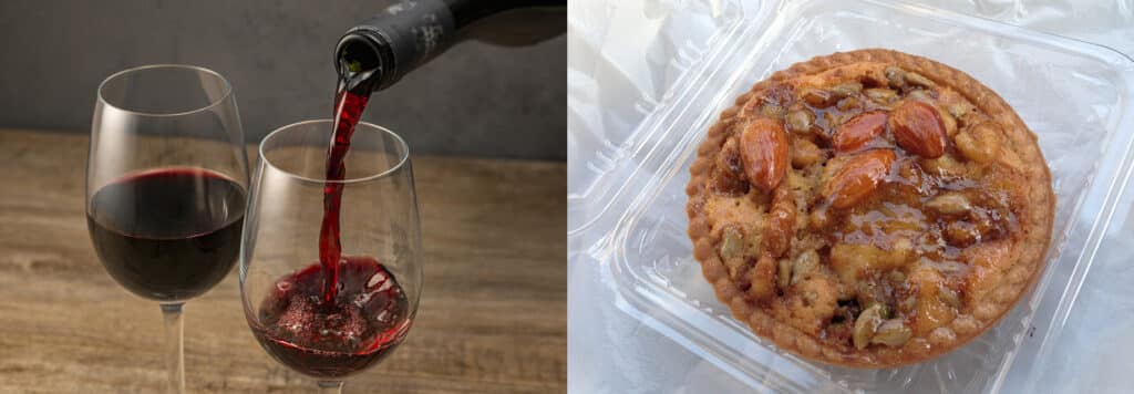 赤ワインに含まれるタンニンが、ドライフルーツの甘酸っぱさやナッツの香ばしいオイル感と絶妙に調和します。特にイチジクやレーズンを使ったタルトは、ワインの果実味を引き立てる名パートナーです。