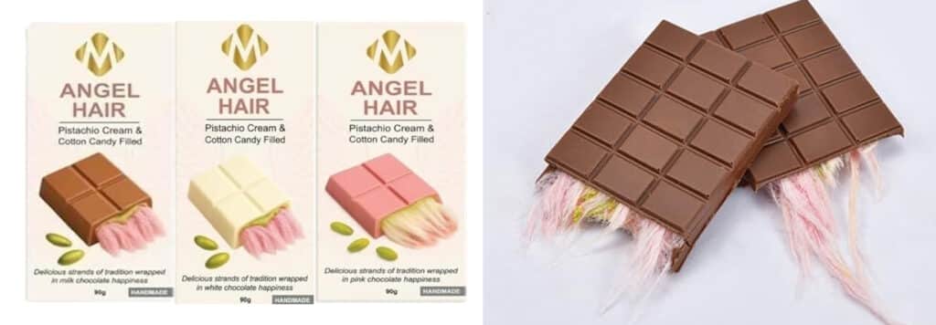 画像引用先:Amazon | エンジェルヘア ピスタチオクリーム&コットンキャンディフィルドチョコレート ハンドメイド 90g Angel Hair ミルク、ホワイト、ピンク+百万両くじ (3種アソートセット) | Chabel | 板チョコ・チョコバー 通販
