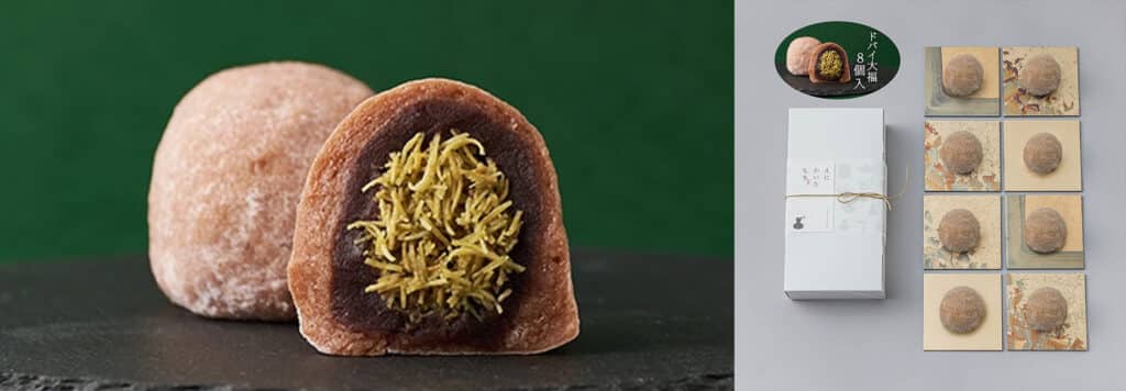 今回のトレンドコラムの締めくくりに、今もっとも注目すべき一品をご紹介します。札幌に本店を構えるお餅の専門店「えにかいたもち」から登場した、その名も『ドバイ大福』です。