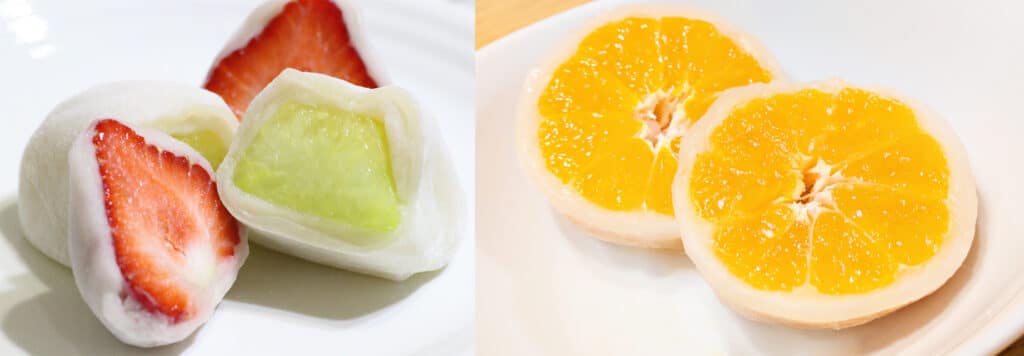 フルーツの水分をどう操るか: フルーツは水分が多いため、そのまま包むとお餅がベタついてしまいます。