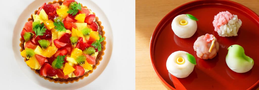 例えば、苺の季節から初夏の果実へとバトンタッチする今の時期、みずみずしいフルーツを使ったタルトや、季節の花をモチーフにした繊細な和菓子。